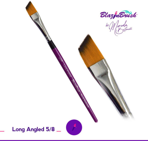 BLAZIN by Marcela Bustamante professzionális arcfestő ferde laposecset 5/8" méret Long Angle A nagyon jó minőségű szintetikus szálak keverékével készült, ami miatt ez az ecset rendkívül tartós és tökéletes az arc és testfestéshez. Kiválóan használható csíkos arcfestékek egymozdulatos felvitelére, vékony-vastag vonalak festésére. A sörte erős, rugalmas, könnyen vezethető. Sörte: szintetikus Méretek: 5/8" Teljes hosszúság: 21 cm
